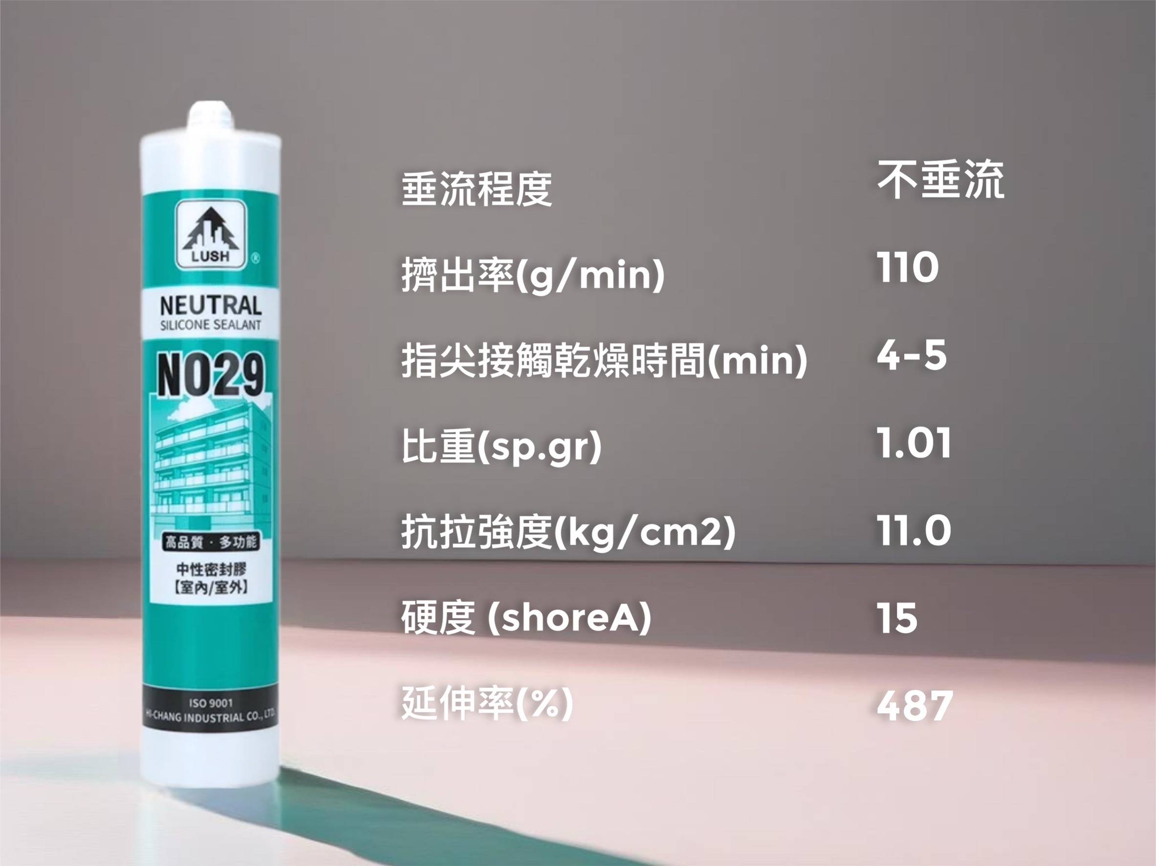 產品介紹PRODUCT 029中性矽利康 N029是中性矽利康密封膠,對大多數建材具良好的黏著性及施工性能, 廣泛用於一般建材接著填縫。 適用範圍 : *適用於石材、金屬、玻璃、鋁材、混凝土、陶瓷、木材、PC板等 *適用於室外/室內一般建材接著填縫 *可用於鹼性基材、非結構性幕牆接口 商品詳述 返回